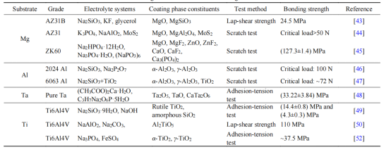 發(fā)布時(shí)間:2024-08-13 11:01:42微弧氧化膜層比常規(guī)涂層擁有更高的膜基結(jié)合強(qiáng)度,因?yàn)槲⒒⊙趸邮窃诮饘倩w表面原位生成并與基體以冶金的方式相結(jié)合,在陶瓷層與金屬基體結(jié)合區(qū)域存在兩相過渡區(qū),兩種膜層的結(jié)合強(qiáng)度較高,尤其是受到外力沖擊下不易脫落,作為功能涂層及輕合金復(fù)合膜層的打底層具有顯著優(yōu)勢(shì)。但在制備微弧氧化陶瓷層的過程中,不同工藝條件下的膜基結(jié)合界面特性會(huì)有較大的差異,放電強(qiáng)度、電解液配比及添加劑、電參數(shù)的改變都會(huì)對(duì)膜層與基體的結(jié)合強(qiáng)度產(chǎn)生影響。不同金屬基體表面微弧氧化涂層的結(jié)合強(qiáng)度如表 1 所示。